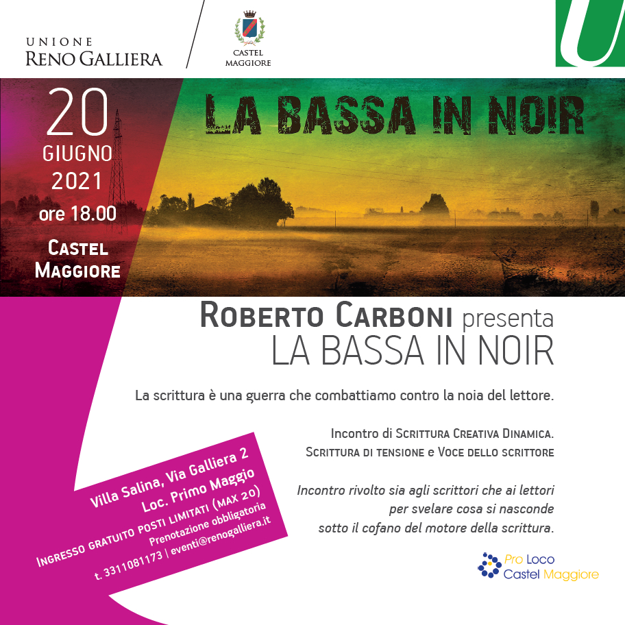 Ritorna la rassegna La Bassa in Noir, promossa da Unione Reno Galliera e Comune di Castel Maggiore, con l’autore bolognese Roberto Carboni: nei due appuntamenti a Villa Salina Malpighi il 13 e 20 giugno ci racconterà i suoi due ultimi libri e ci parlerà di scrittura di tensione.