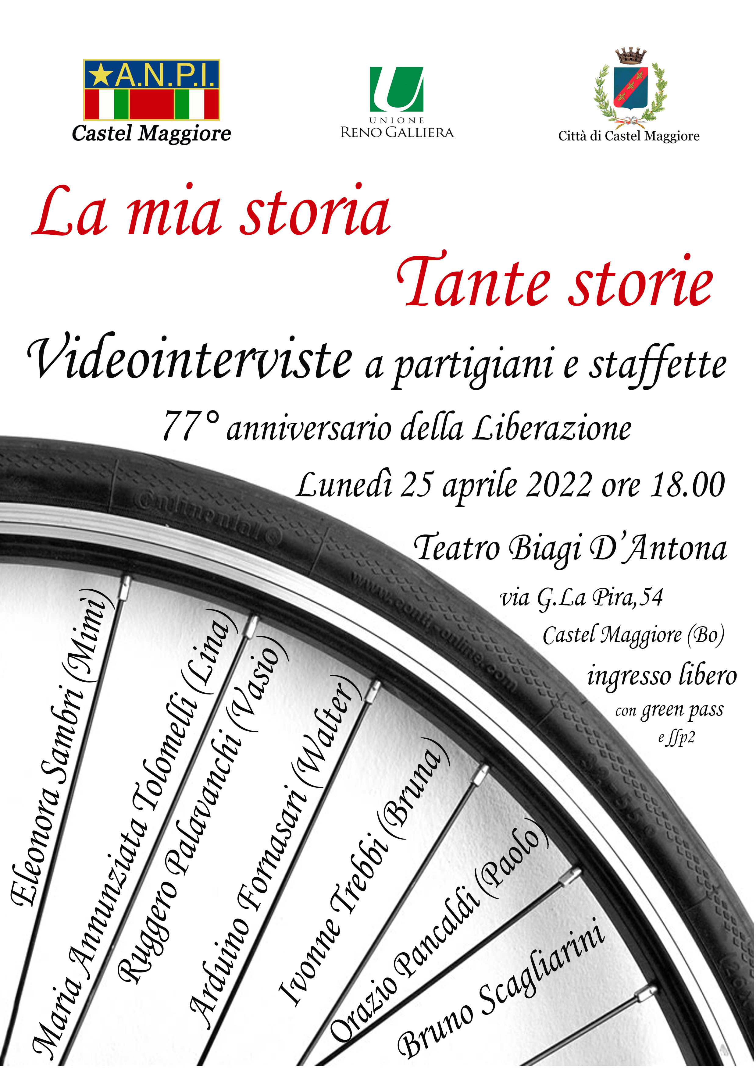 La mia storia, tante storie lunedì 25 aprile 2022 La mia storia, tante storieVideointerviste a partigiani e staffette77° della LiberazioneEleonora Sambri (Mimì)Maria Annunziata Tolomelli (Lina)Ruggero palavanchi (Vasio)Arduino Fornasari (Walter)Ivonne Trebbi (Bruna)Orazio Pancaldi (Paolo)Bruno ScagliariniLunedì 25 aprile 2022 ore 18.00Teatro Biagi D'Antona, Via G. la Pira 54 categoria Promozione del libro, della lettura e della scrittura dove Teatro Biagi D'Antona, Via G. La Pira 54, 40013 Castel Maggiore quando lunedì 25 aprile 2022 e-mail anpicastelmaggiore@libero.it"