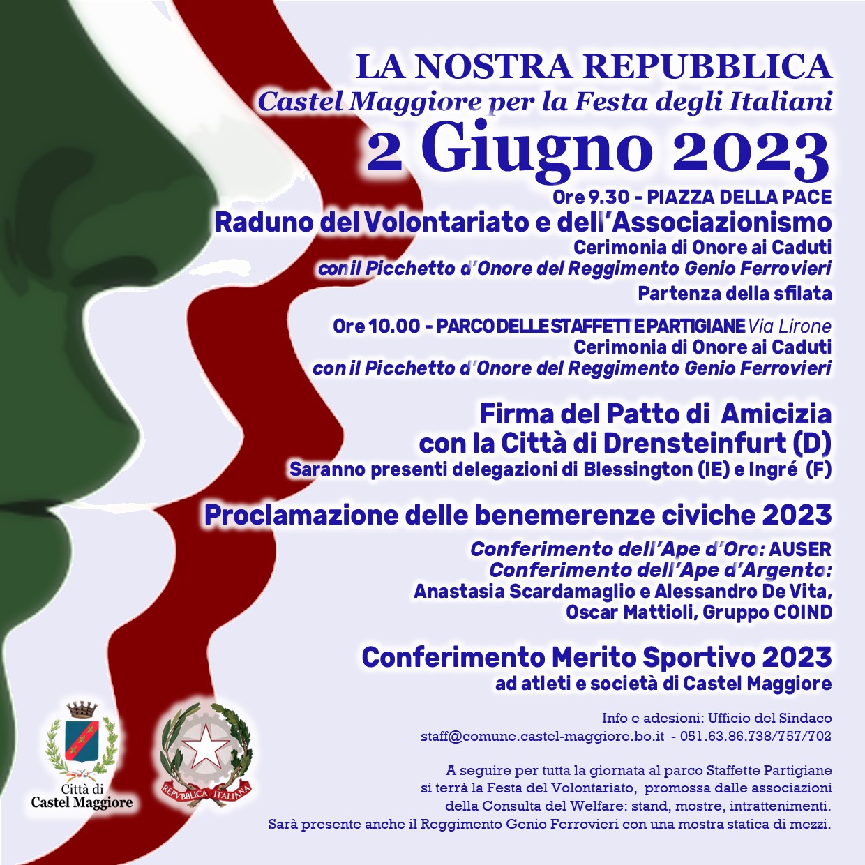 Venerdì 2 giugno si annuncia una grande giornata, all’insegna dei valori di solidarietà e di europeismo che vengono considerati fondanti della coesione nazionale e della nostra Repubblica Italiana,  ma anche di riflessione su quanto accaduto a Castel Maggiore e in Emilia-Romagna il 17 maggio.