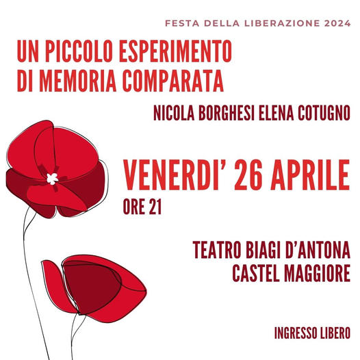 Agorà celebra il 79° anniversario della Liberazione dell’Italia dal nazifascismo con un doppio appuntamento: sul palco del Teatro Biagi D’Antona di Castel Maggiore (BO), venerdì 26 aprile alle ore 21, s’incontrano Nicola Borghesi, fondatore di Kepler-452ed Elena Cotugno, attrice e co-direttrice della compagnia Teatro dei Borgia. Un piccolo esperimento di memoria comparata sarà un viaggio dall’Europa all’Italia, per chiederci, ancora una volta, come fare memoria oggi. Ingresso libero, prenotazione consigliata.