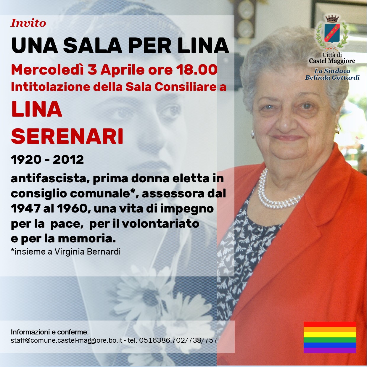 Nata a Casalecchio di Reno il giorno 1 gennaio 1920, Lina Serenari visse a Castel Maggiore per quasi tutta la vita, morì a Bologna il 31 marzo 2012. Lina partecipò attivamente alla Resistenza a Castel Maggiore, nel battaglione Cirillo della 4ª brigata Venturoli Garibaldi. Dopo la guerra, il suo impegno, come quello di tante altre compagne, non si fermò: nelle elezioni amministrative della primavera del ’46, le prime a suffragio maschile e femminile, lei e la maestra Virginia Bernardi furono le prime donne a diventare Consigliere comunale a Castel Maggiore.