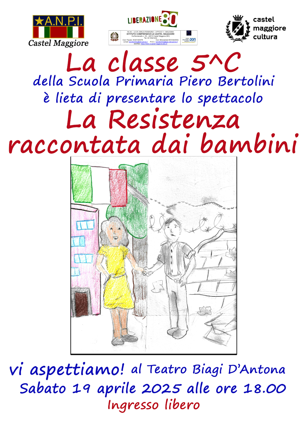 La Resistenza raccontata dai bambini sabato 19 aprile 2025 alle 18.00 La classe 5^ C della Scuola Primaria Piero Bertolini è lieta di presentare lo spettacoloLa Resistenza raccontata dai bambiniVi aspettiamo al Teatro Biagi D'Antona Sabato 19 aprile 2025 ore 18.00Ingresso libero categoria Tradizioni, Storia e Memoria dove Teatro Biagi D'Antona, Via G. La Pira 54, 40013 Castel Maggiore quando sabato 19 aprile 2025