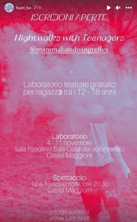 FUORI! invita Mammalian Diving Reflex come compagnia residente a Bologna per lintero arco del progetto, per la realizzazione di diverse Nightwalks in diversi luoghi della città e con diversi gruppi di ragazzз, ingaggiatз sia attraverso le scuole sia con la tessitura di relazioni capillari con gli spazi e le persone che nei diversi quartieri – tutti più o meno periferici nella geografia della città – operano quotidianamente.