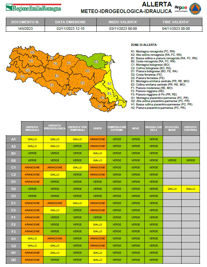 Allerta n.145 valida per tutta la giornata del 3 novembre 2023