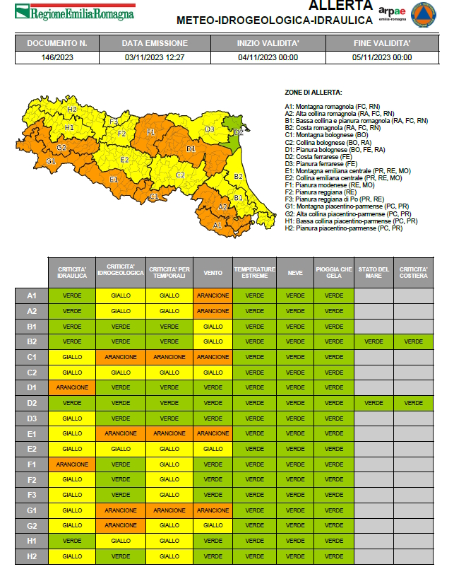 Allerta n.146 valida per tutta la giornata del 4 novembre 2023