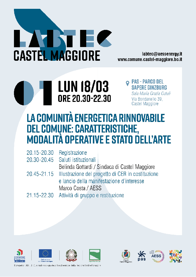 Il Comune di Castel Maggiore è uno delle 13 enti regionali che, grazie ai fondi europei della Regione Emilia-Romagna e al supporto di AESS (Agenzia per l’Energia e lo Sviluppo Sostenibile), daranno inizio al LAB.T.E.C., un percorso di incontri partecipati che avrà l’obiettivo di attivare una riflessione sulla transizione energetica, sulle opportunità ad essa legate e sul contributo attivo che ognuno può dare a questo importante processo di decarbonizzazione e contrasto al cambiamento climatico.