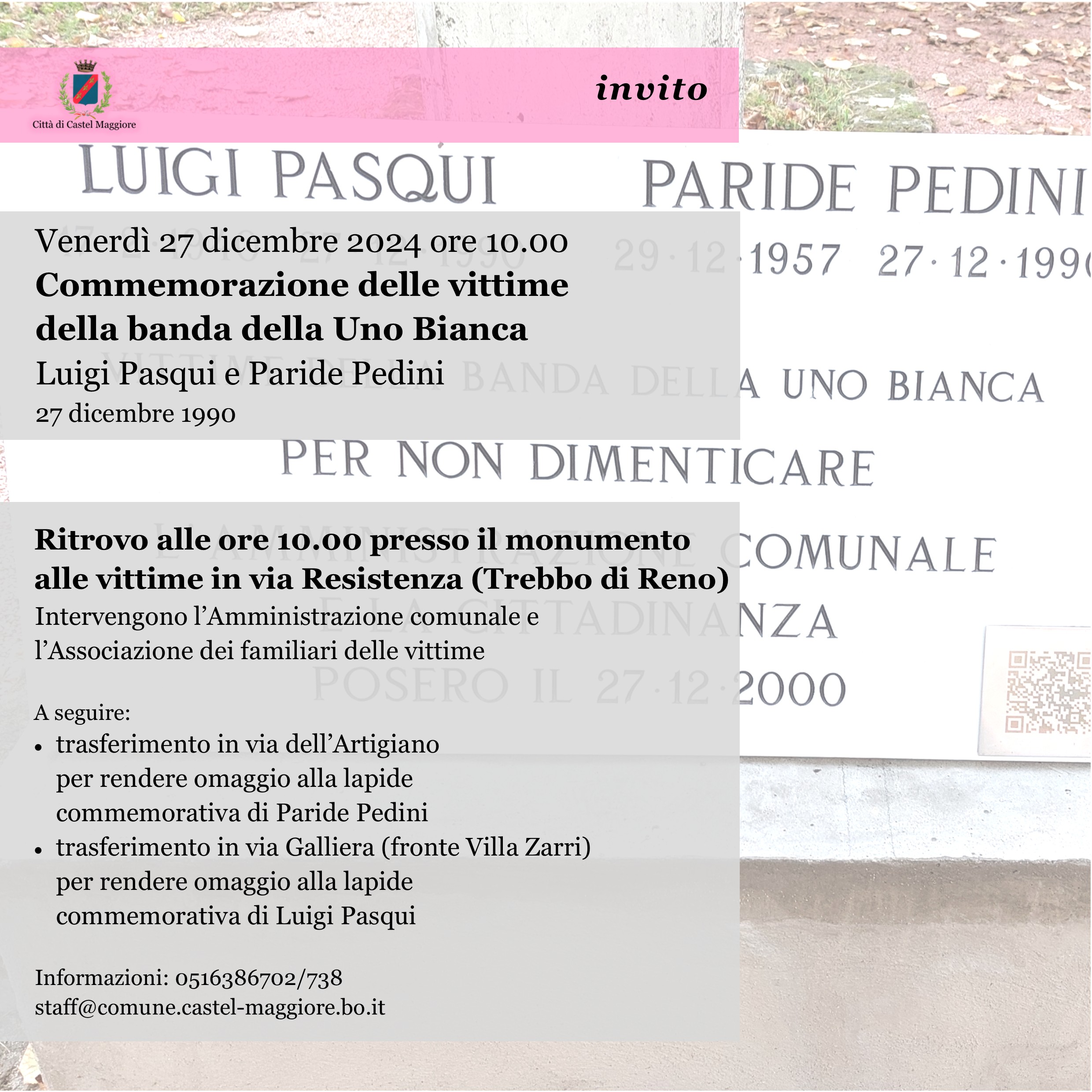 L'omaggio alla memoria di Luigi Pasqui e Paride Pedini, vittime della “banda della uno bianca”, si tiene nel 34° anniversario della scomparsa, sui luoghi dove il 27 dicembre 1990 i due cittadini di Castel Maggiore furono assassinati: presso la stazione di servizio sulla Provinciale Galliera, dove Luigi Pasqui fu freddato al termine di una rapina, e a Trebbo di Reno, davanti all'abitazione di Pedini, sfortunato testimone del cambio di vettura da parte dei banditi.